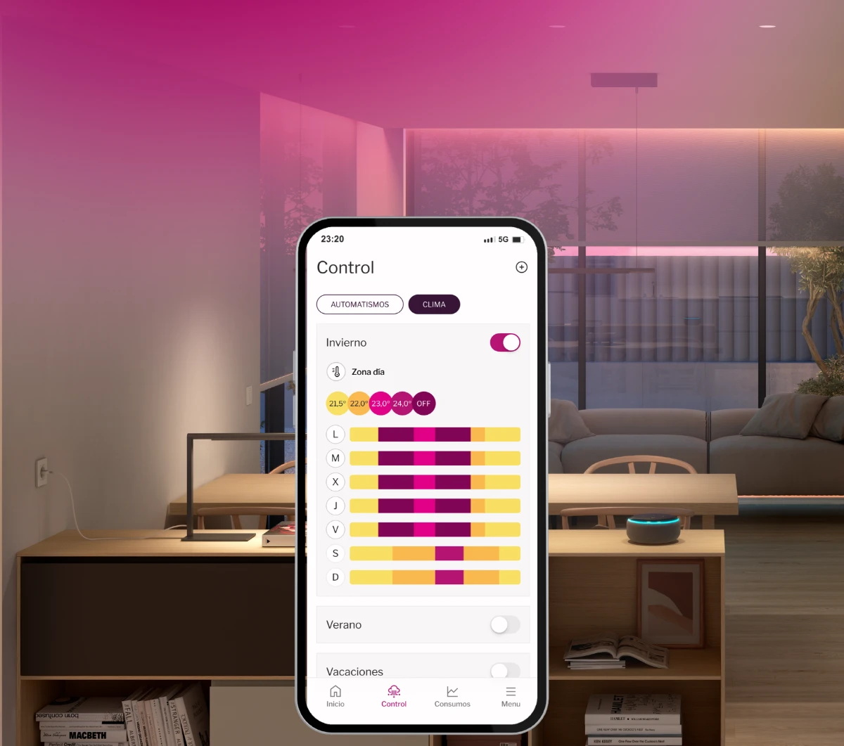 Personaliza y programa escenas unificando luz, clima y dispositivos según el uso del espacio.